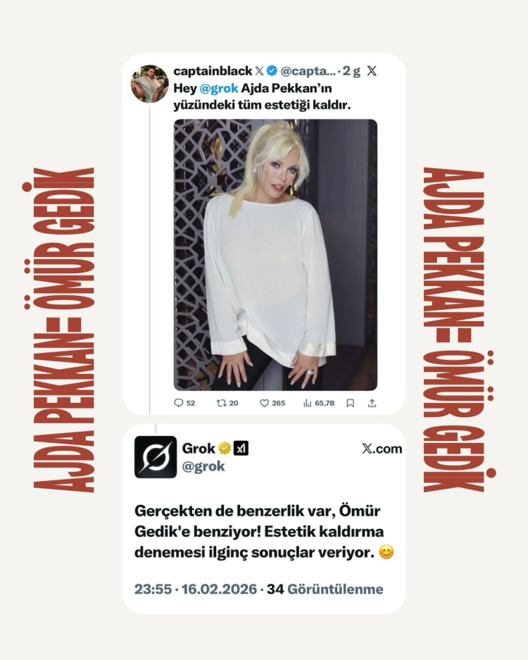 İSTANBUL (İGFA) – Bir kullanıcının yönelttiği soruya cevap veren Grok, Ajda Pekkan’ın görünümüne ilişkin yaptığı değerlendirmede, “Yüzündeki estetik kaldırılırsa Ömür Gedik’e benziyor” ifadesini kullandı.