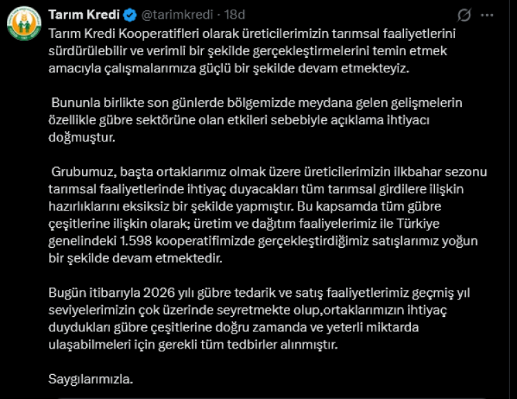 Tarım Kredi Kooperatifleri, üreticilerin ihtiyaç duydukları gübre çeşitlerine doğru zamanda ve yeterli miktarda ulaşabilmeleri için gerekli tüm tedbirlerin alındığını belirtilirken, üreticilerin tarımsal faaliyetlerinde herhangi bir aksama yaşanmaması için çalışmaların güçlü şekilde sürdürüldüğü vurgulandı.